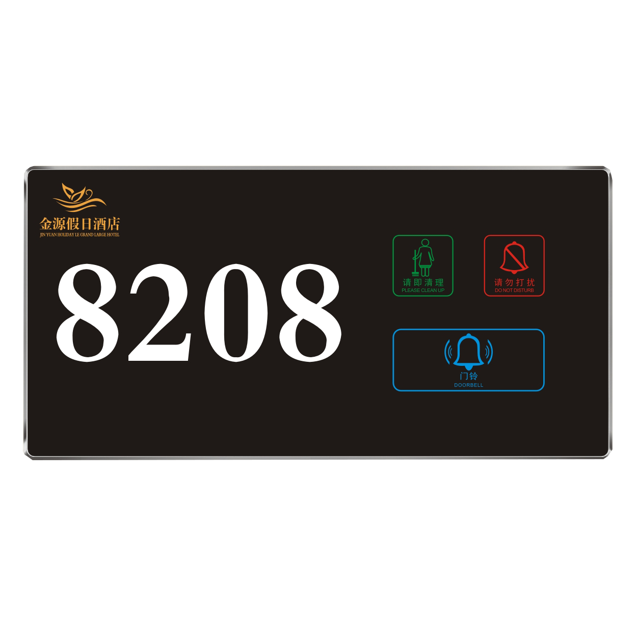 2、客人按下房間內的"請勿打擾”開關,液晶屏的"請勿打擾”圖案背光亮起,門外顯示屏中提示請不要打擾,此時門鈴按鍵不起作用。